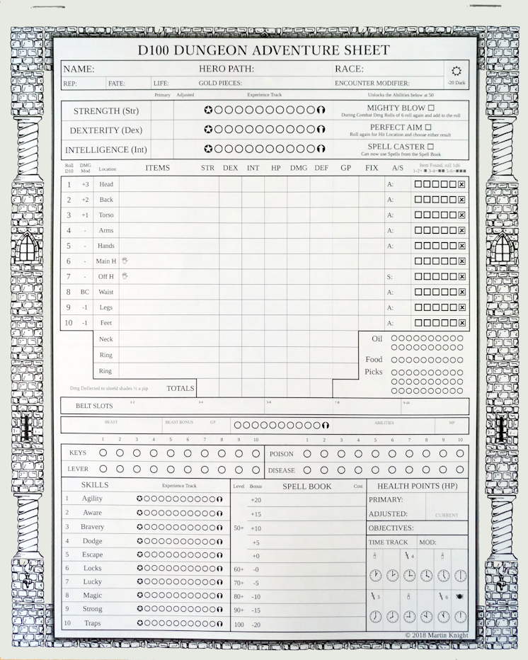 D100 DUNGEON ist ein von dem Briten Martin Knight entwickeltes Solo-Dungeon-Abenteuer in Buchform, dass erstmals 2017 erschien. Seit 2018 ist das Spielsystem in seiner 3. Edition erhältlich, auf der auch diese Besprechung beruht. Man bekommt es über DriveThruRPG in PDF- und Druckform. Zusatzkomponenten werden von The Game Crafter aus den USA vertrieben. Martin Knight betreibt auch eine eigene Webpräsenz, MK-GAMES, die auch einen Überblick über andere Spiele von ihm gibt und ein eigenes Diskussionsforum besitzt. Auch auf Boardgamegeek ist es vertreten, wo es aktuell ein Rating von 7.8 genießt.